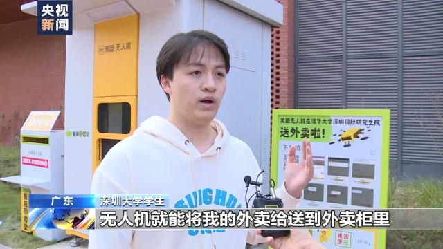 深圳大学学生:支付成功以后,大概十几分钟,无人机就能将我的外卖送到外卖柜里。
