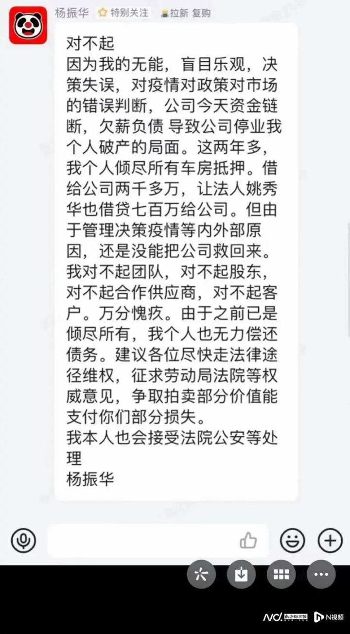据媒体报道,针对熊猫不走蛋糕走向倒闭的原因,其创始人杨振华将其归咎为“管理决策疫情等内外部原因”。在解散工作群之前,根据员工提供的聊天截图,杨振华曾在其中一个工作群里向员工致歉。