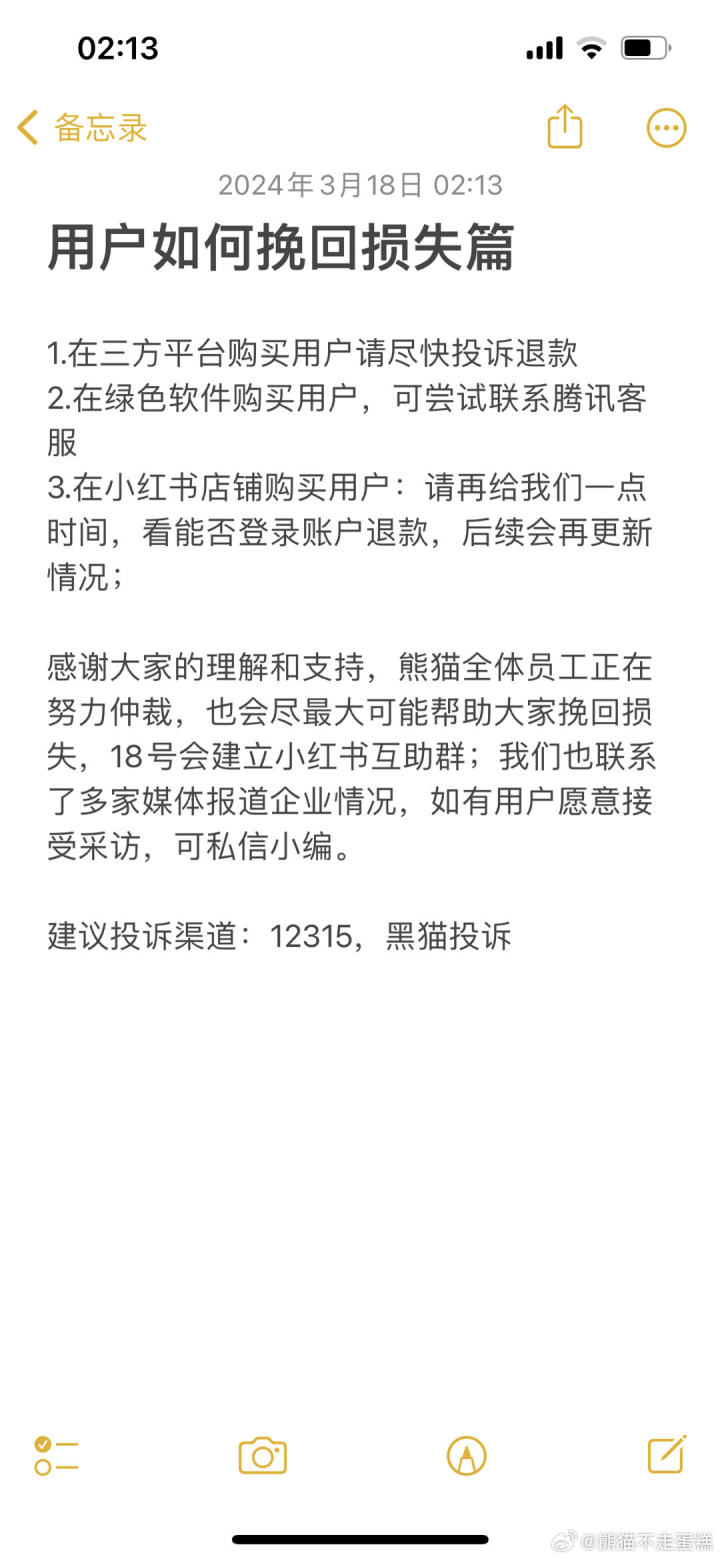 目前,公司员工在“熊猫不走蛋糕”官博评论区发布了一份“用户如何挽回损失篇”的指南,此外,还建起了“用户维权群”。