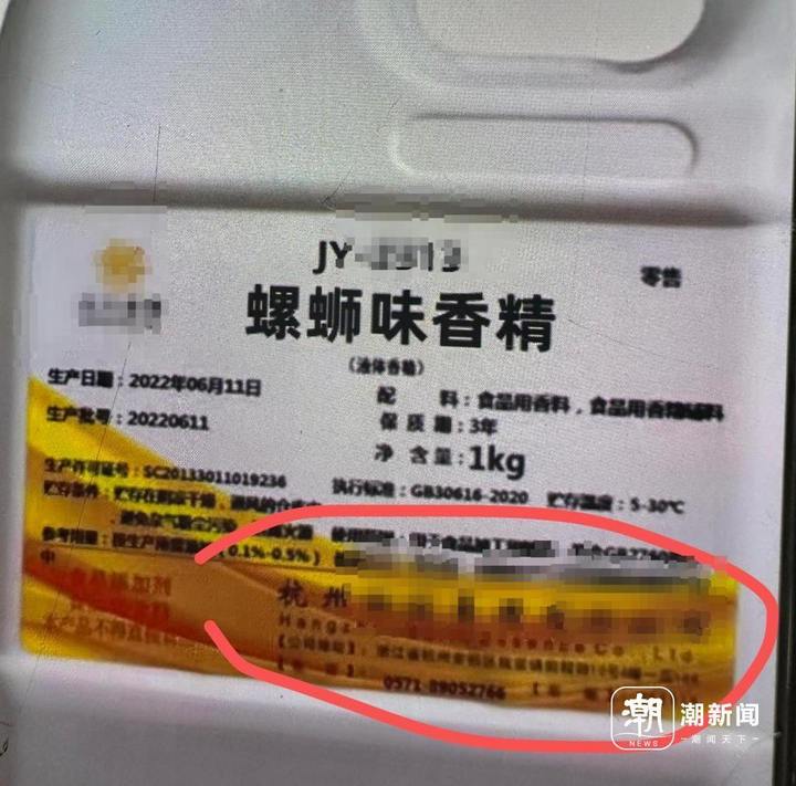其中一款产品,其白色桶身贴着“螺蛳味香精”,为河南许昌一家经销商代理销售。潮新闻记者以买家身份咨询:“里面都是些什么?”该经销商张雷(化名)直言:“都是化学合成的,有专业腥臭香精,主要是增加螺肉的腥味和酸笋的臭味。”