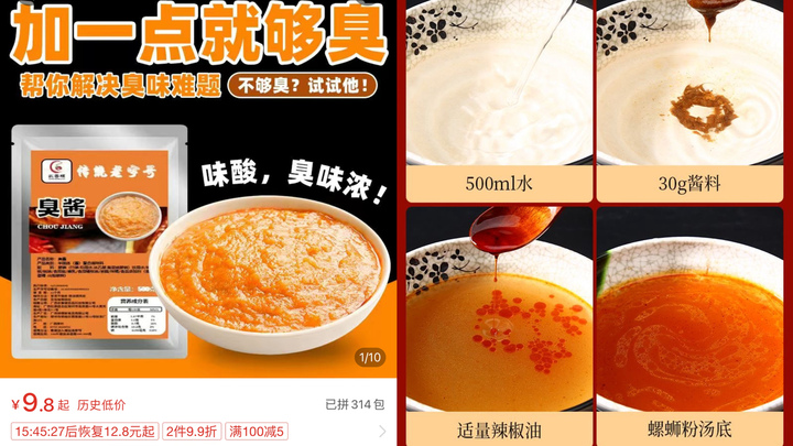 在各大电商平台,潮新闻记者发现,这样的螺蛳粉增臭剂还有很多,质量层次不齐。除了纯香精勾兑的汤底,也有部分商家推出19.9元的酱料包“买一送一”促销,宣称“不要熬制、小白都能开店”。其中不少增臭酱产自柳州。