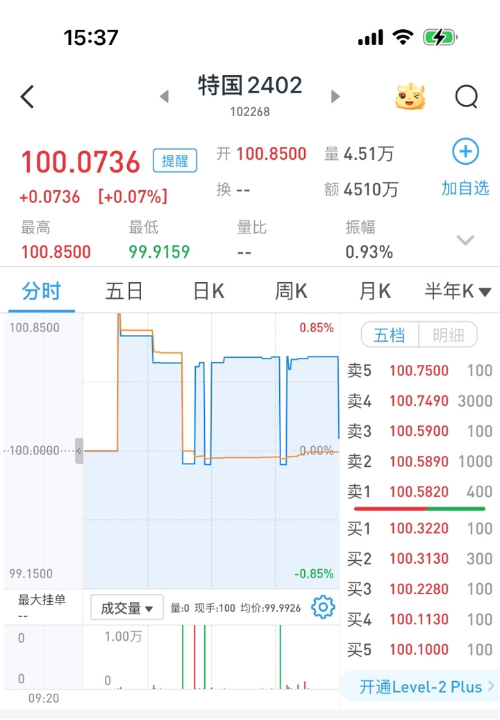 15时30分,“24特国02”收涨0.59%,收盘报100.59元,成交金额13.77亿元。该成交日,“24特国02”最高价为100.895元,最低价为100.5元。
