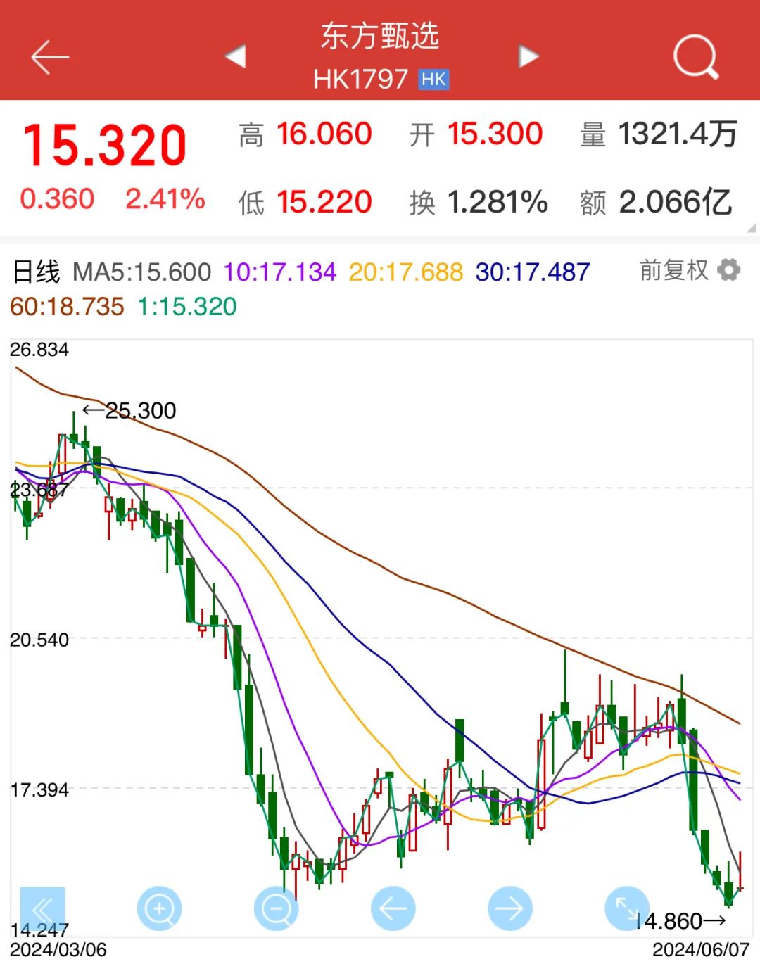 每日商报讯 在连续5个交易日大跌之后,6月7日东方甄选终于止跌转涨。截至今天港股收盘,东方甄选涨2.41%,报15.32港元。