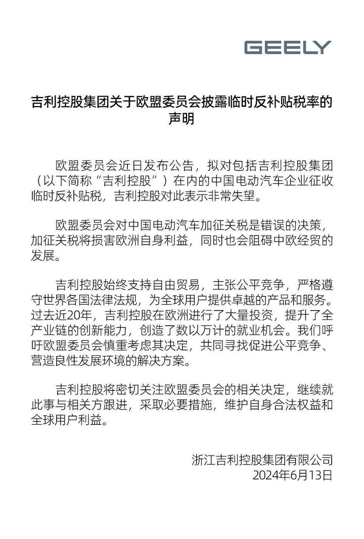 吉利控股呼吁欧盟委员会慎重考虑其决定,共同寻找促进公平竞争、营造良性发展环境的解决方案。