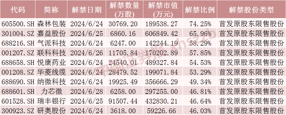 下周面临解禁的89只股票中,解禁股数量占总股本比例超过50%的股票有六只,分别为森林包装、嘉益股份、气派科技、联科科技、悦康药业、华菱线缆,其解禁比例分别为74.25%、65.96%、58.29%、57.85%、54.53%、53.29%。这六只股票下周解禁后流通盘将分别增加288.35%、259.64%、142.63%、139.56%、119.94%、114.80%。此外,瑞丰银行、安凯微、华丰科技下周解禁后流通盘将分别增加115.78%、154.15%、179.80%,即下周共有9只股票解禁后流通盘将增加超100%。