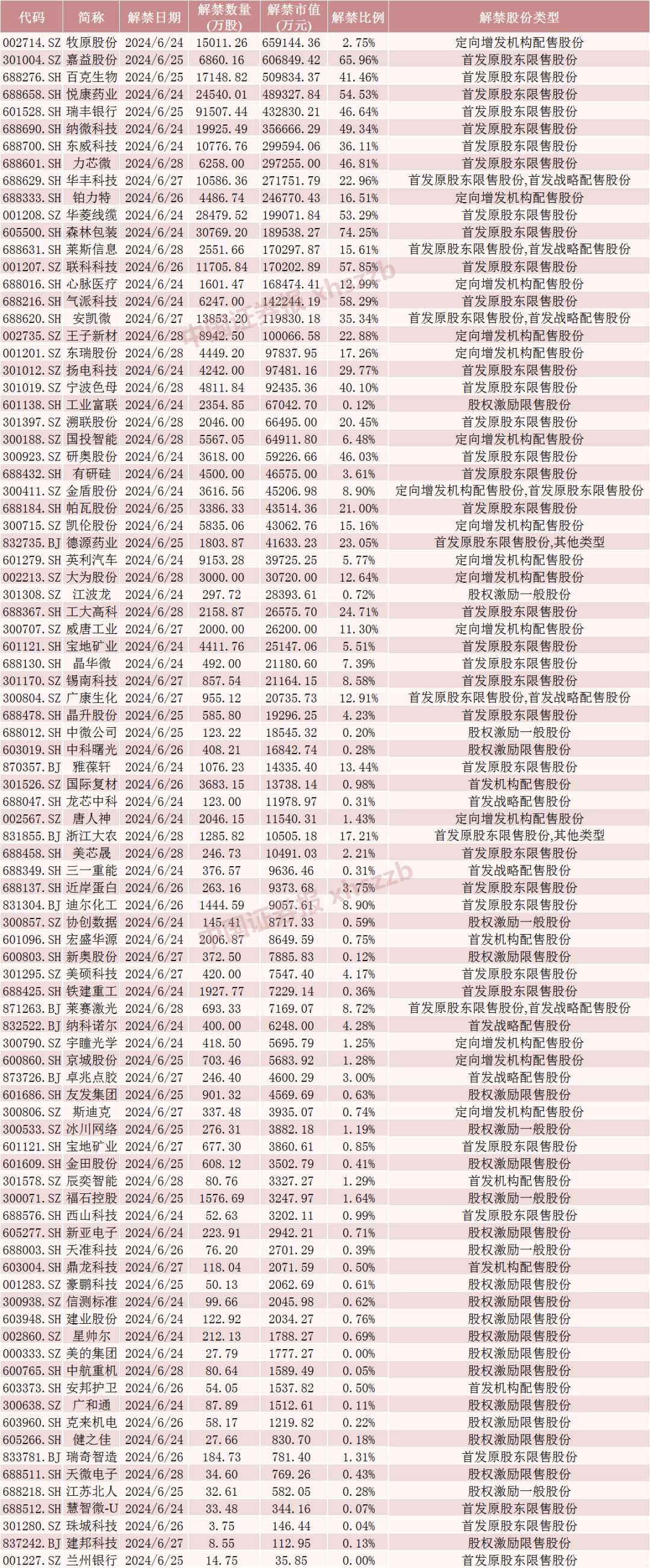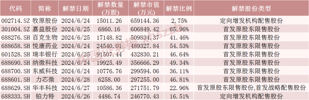 牧原股份6月24日将解禁1.5亿股,均为定向增发机构配售股份。嘉益股份6月25日将解禁0.69亿股,百克生物6月25日将解禁1.71亿股,均为首发原股东限售股份。