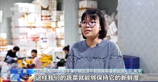 江西赣州市寻乌县幸福小镇宜源华智慧蔬菜基地管理人员 黄萍:这样我们的蔬菜就能够保持新鲜度,然后再用冷链车当天运到大湾区。