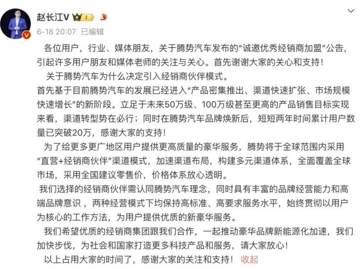 针对业界的关注,腾势销售事业部总经理赵长江发文表示,之所以不再坚持直营模式,主要是基于目前腾势汽车的发展已经进入“产品密集推出、渠道快速扩张、市场规模快速增长”的新阶段,“立足于未来50万级、100万级甚至更高的产品销售目标实现来看,渠道转型势在必行。”