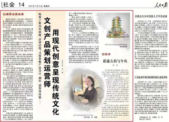 今年5月,人力资源和社会保障部公示了新一批19个新职业,文创产品策划运营师位列其中。武汉市委宣传部、市总工会、市文化和旅游局等部门每年都会举办文化创意设计大赛、文创产品展览会、非遗传承培训等活动,通过以赛促学、以赛促教的方式,提升从业人员的技能。