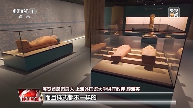 展览首席策展人、上海外国语大学讲座教授 颜海英:选了10个最精美的,而且样式都不一样的彩绘人形棺,其中最大的一个特点就是它的脸涂成不同的颜色,现在展厅里面立着一个绿脸的棺,然后还有红脸的、黑脸的,那它具体是什么不同的象征含义,现在我们还没有解读,这是未来将要研究的问题。