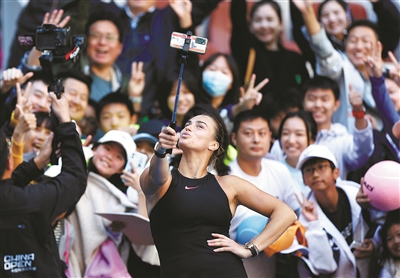 10月2日,白俄罗斯选手萨巴伦卡获胜后与观众自拍。当日,在北京进行的2024中国网球公开赛女单第四轮比赛中,萨巴伦卡2比0战胜美国选手凯斯,晋级八强。 新华社记者 王丽莉 摄