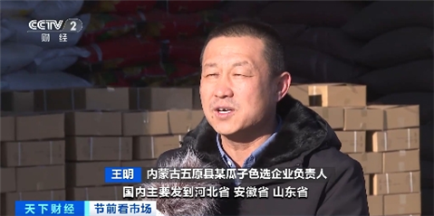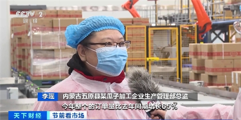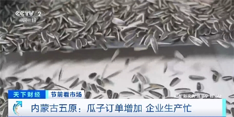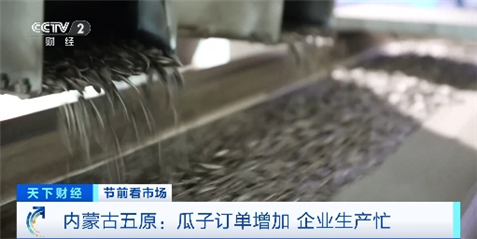 内蒙古五原县某瓜子加工企业生产管理部总监 李瑶:今年整体的订单量较去年同期增长65%,日均产量大概在20万斤左右。高峰期预计在1月20日到25日结束。我们要保持24小时的全线生产,才能满足全国的发货需求。