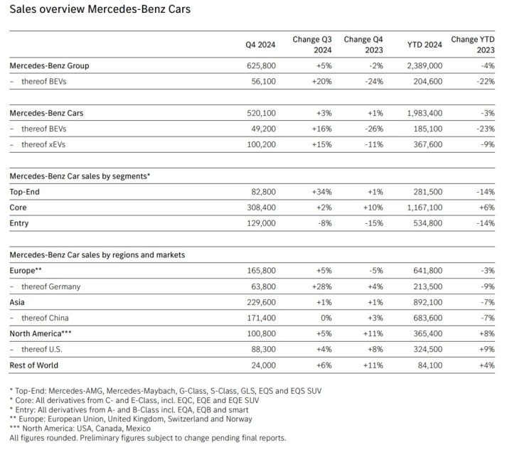 梅赛德斯-奔驰集团在2024年交付新车238.9万辆,同比下滑4%,其中梅赛德斯-奔驰汽车销量为198.3万辆,同比下滑3%;纯电动车型销量为18.5万辆,同比下滑23%。在中国市场,奔驰全年销量为68.36万辆,同比下滑7%,占全球销量29%。