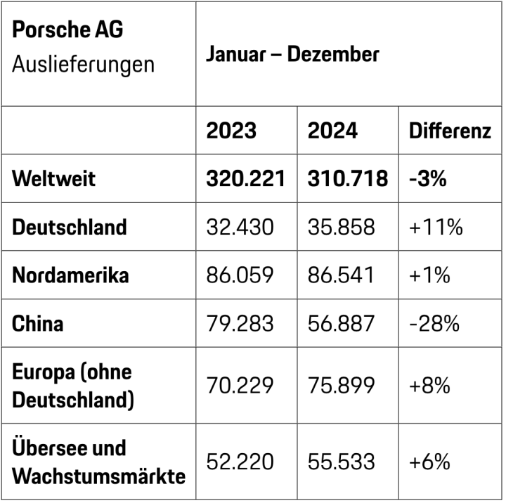 都市快报讯 保时捷近日在法兰克福证券交易所公布的2024年销量数据显示,其2024年全球交付量为31.07万辆,同比下滑3%。其中在华销量下滑幅度达28%,全年销售5.69万辆,成为保时捷去年全球销量下滑的主要原因。这也是保时捷中国连续三连跌,更是其连续第二年失去全球最大单一市场位置。