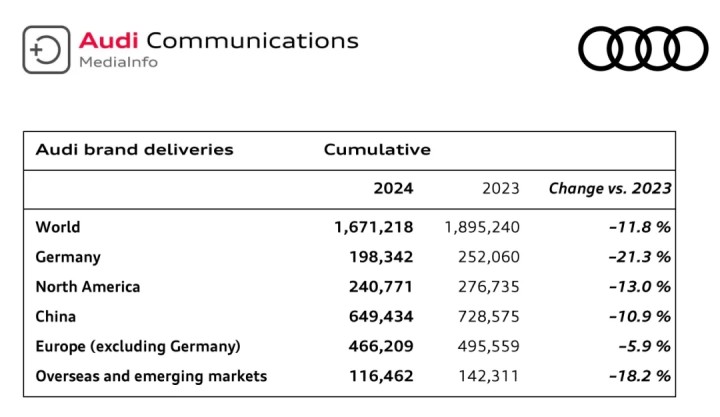 至于奥迪集团,其由奥迪、宾利、兰博基尼三大品牌组成,2024年交付新车167.1万辆,同比下滑12%。奥迪在中国交付新车64.94万辆,同比下滑10.9%,占全球销量39%。