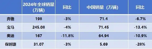 而称霸国内豪车市场几十年的BBA同样出现了下滑,奔驰、宝马、奥迪先后公布了2024年全球销量及在华销量。具体来看,奔驰全球汽车销量同比下降3%至198.34万辆,中国区销量同比下降7%至68.36万辆;宝马全球销量为245.08万辆,同比下滑4%,中国区71.45万辆,同比下降13.4%;奥迪全球销量为167.12万辆,同比下降11.8%,中国市场64.9万辆,下降了10.9%。