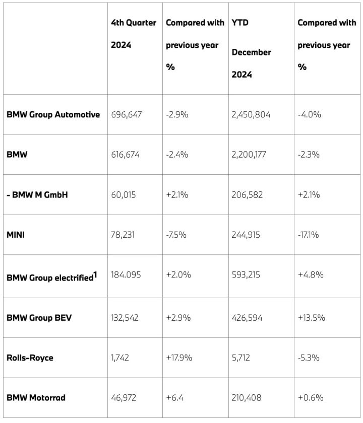 宝马集团2024年销量245.1万辆,同比下滑4%,其中宝马品牌销量为220.0万辆,同比下滑2%;MINI品牌为24.5万辆,同比下滑17%;劳斯莱斯品牌为5712辆,同比下滑5.3%。此外,宝马电动化车型销量为59.3万辆,同比增长5%,其中纯电动车销量为42.7万辆,同比增长13.5%。在中国市场,宝马交付新车71.45万辆,同比下滑13.4%,占全球销量29%。