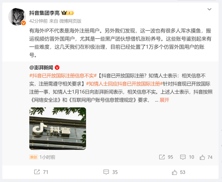 今天,抖音集团副总裁李亮也在社交平台回应称,有海外IP不代表是海外注册用户。