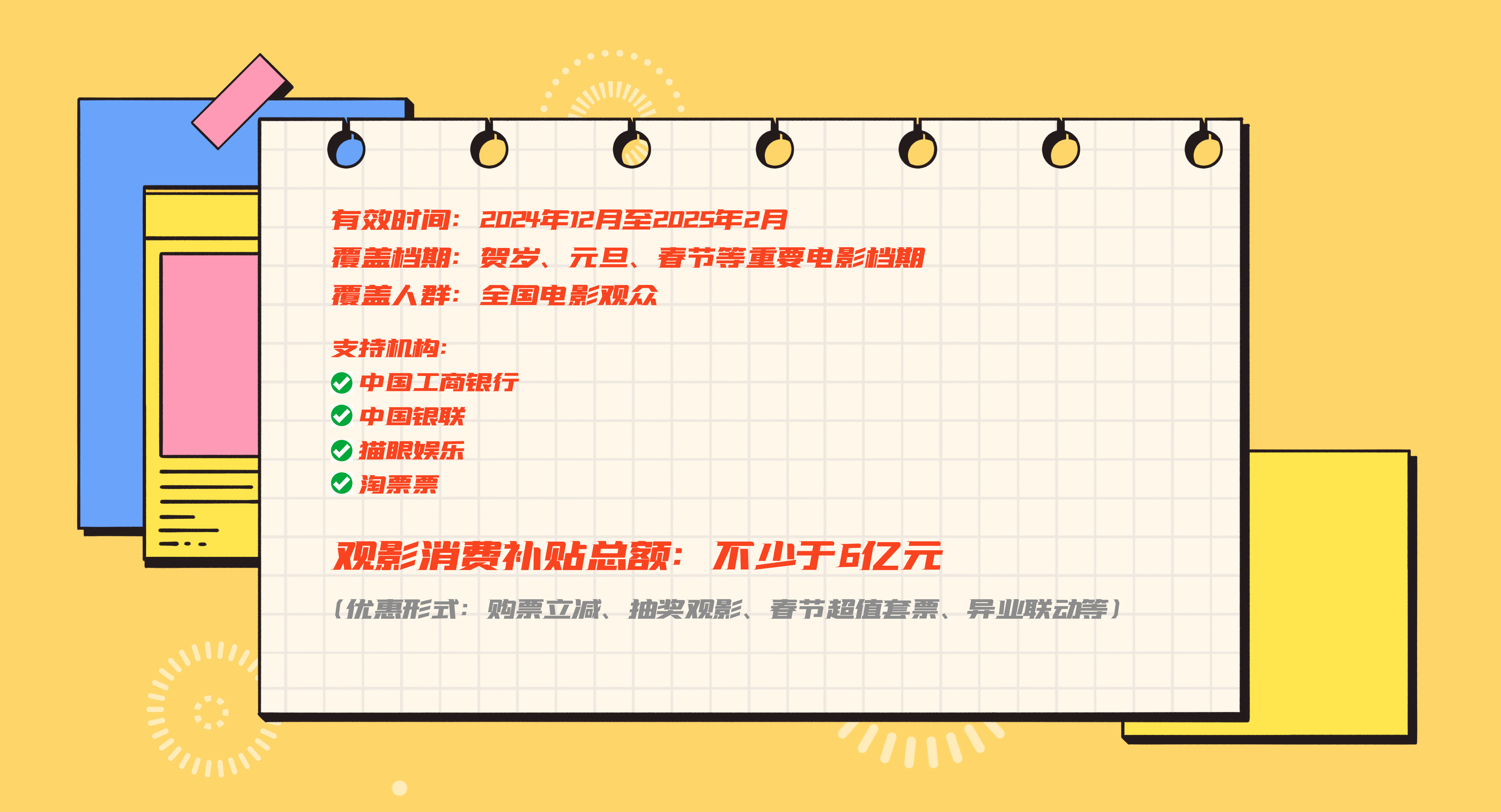 2024年12月9日至2025年2月28日,用户可以通过猫眼App、猫眼微信小程序、美团App、大众点评App任一渠道,进入“跨年贺岁 喜迎新春——全国电影惠民消费季”页面,领取消费季专属优惠,参与冬日观影嘉年华、抽“买一赠一”观影红包、单片19.9元起大额补贴、春节超值特惠等活动,获得观影优惠。
