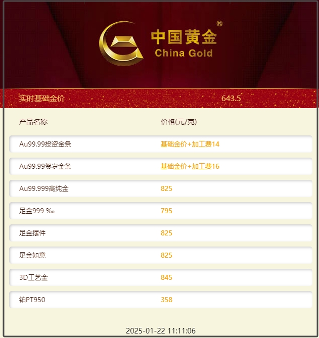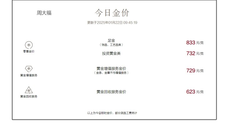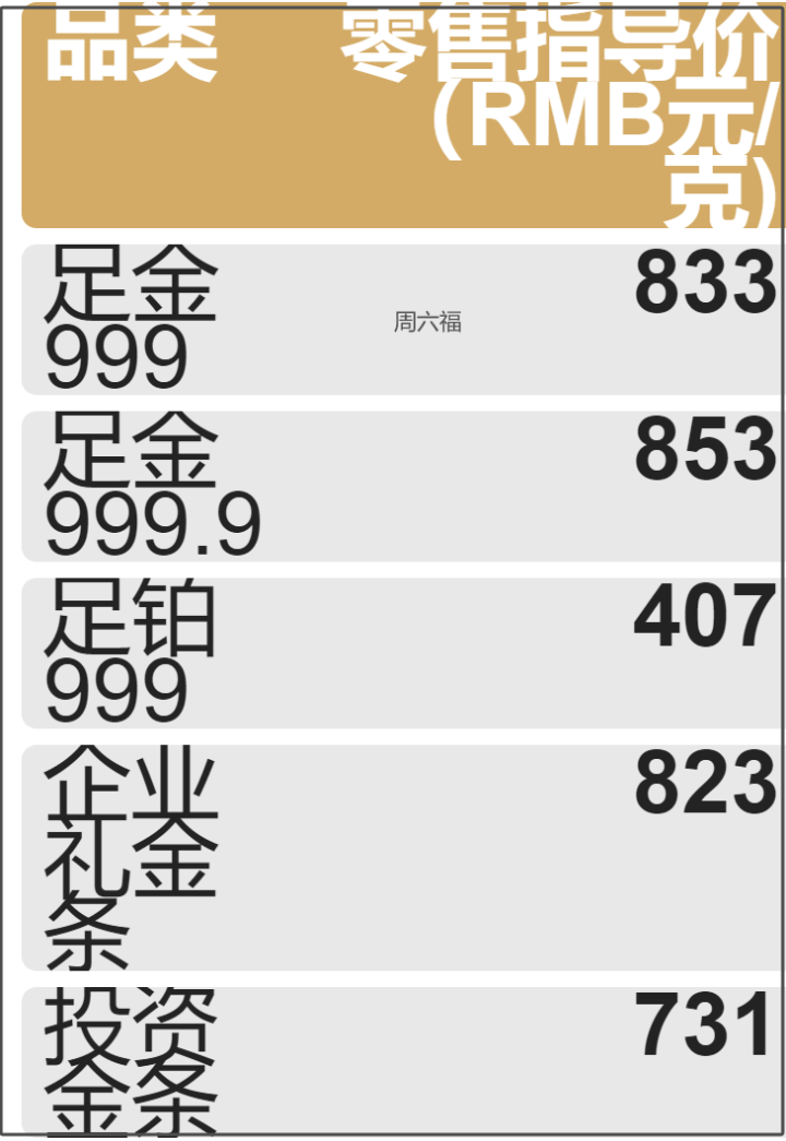 橙柿互动记者查询了周大福、周六福、周生生、潮宏基和中国黄金的今日金价:前四者999足金都是833元每克,中国黄金是825元每克。