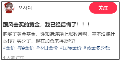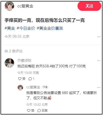 网友“cc爱黄金”今日发帖表示后悔自己只买了一克。