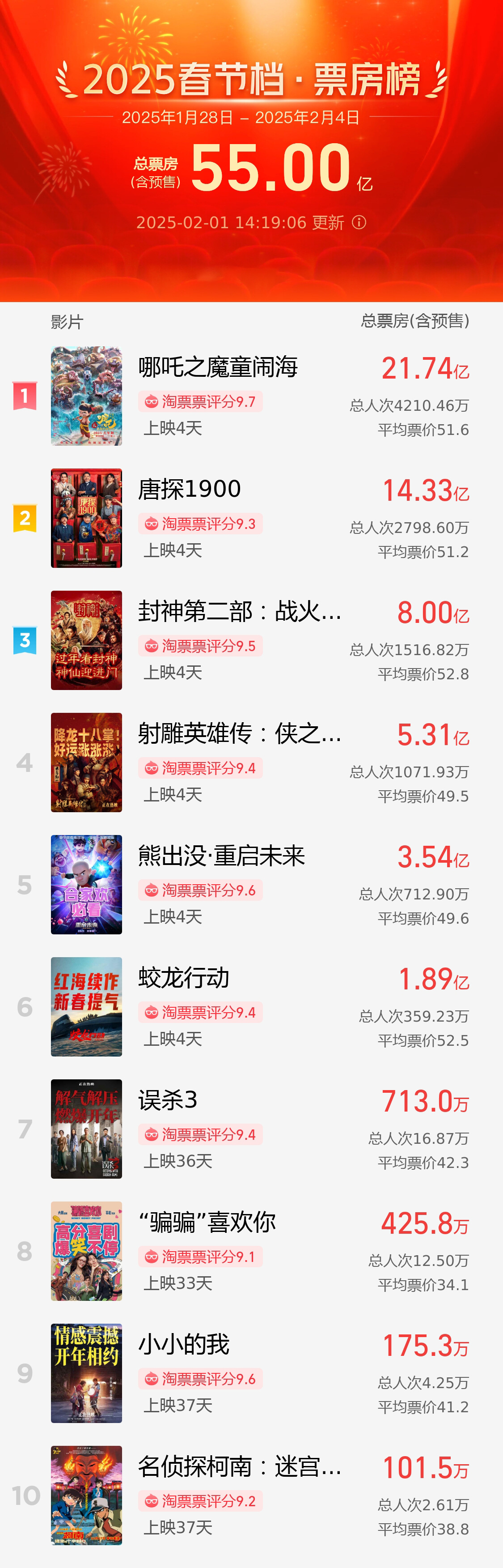 2025春节档总票房超55亿