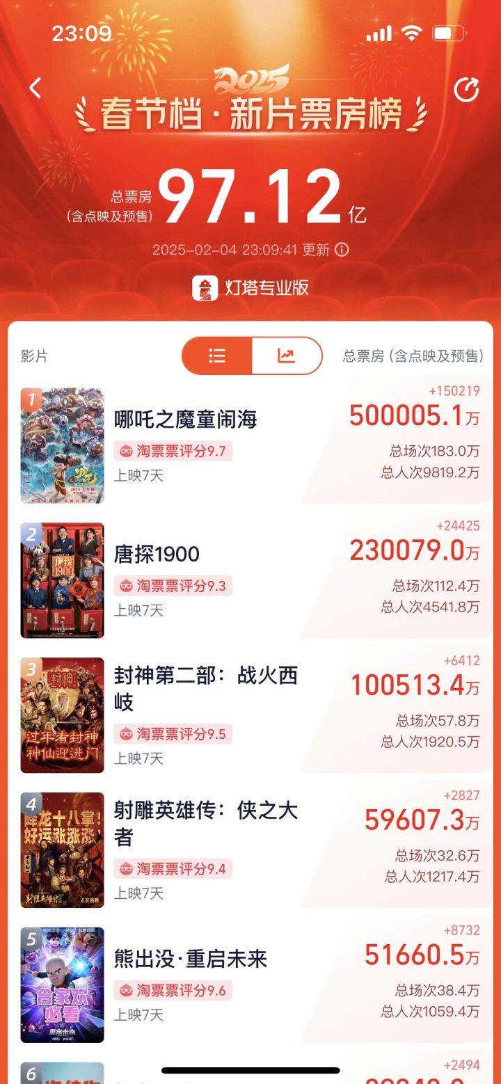 2月4日,灯塔专业版显示,上映仅仅七天的《哪吒之魔童闹海》,总票房(含预售)已突破50亿了!