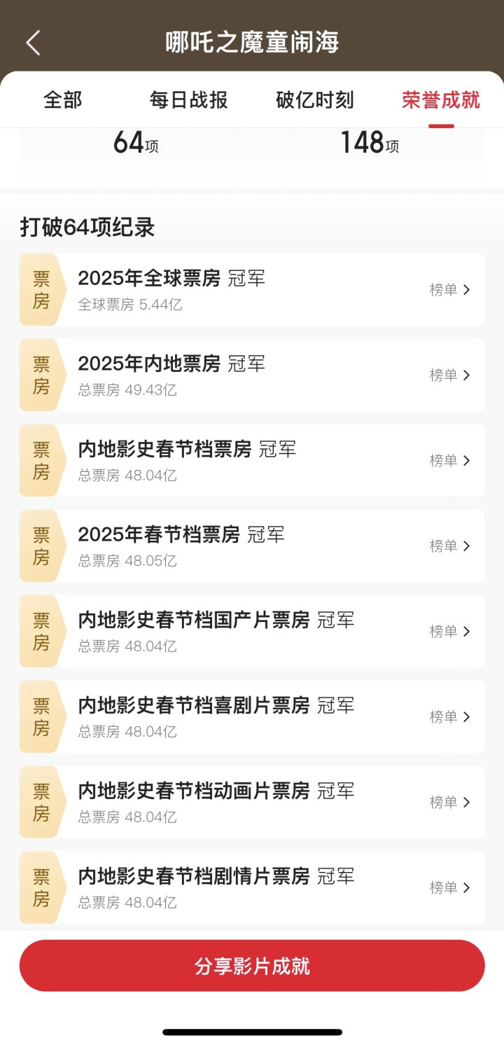 4.87亿、4.8亿、6.19亿、7.31亿、8.12亿、8.43亿、8.52亿……《哪吒2》自大年初一上映后,凭着好口碑,票房一路逆势上涨,屡创新高。截至目前,它不仅是今年春节档冠军,还是今年内地票房冠军、全球票房冠军。