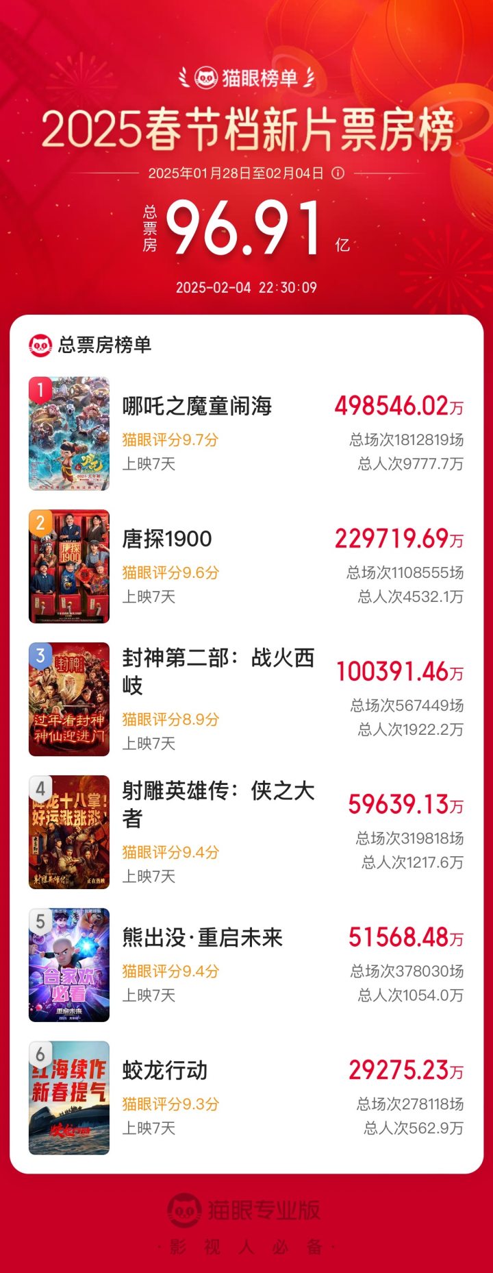 今年春节档捷报频传。猫眼专业版数据显示,截至2月4日22:30,今年春节档新片总票房(含预售)达到了96.91亿,大幅刷新了中国影史春节档最高票房纪录,观影人次更是达到了1.86亿,同样也刷新了中国影史春节档最高观影人次纪录。