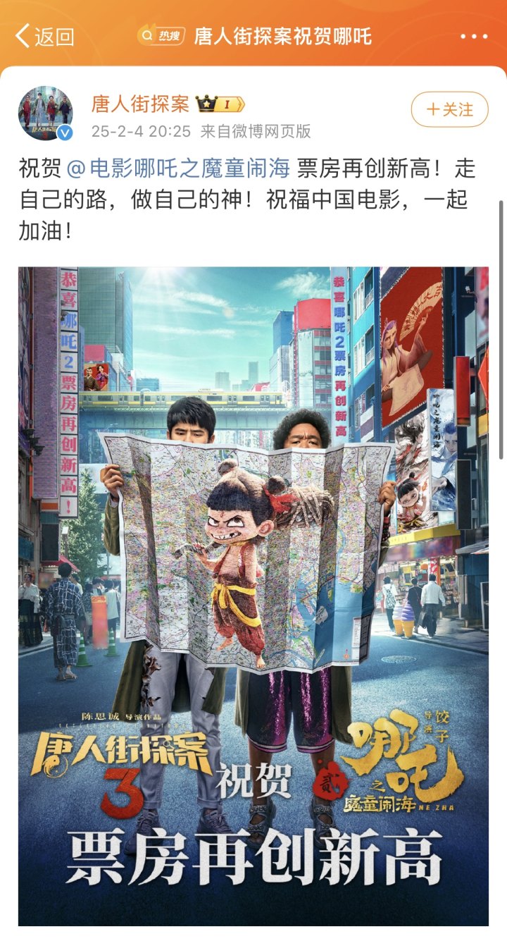 《唐人街探案》2月4日晚还特意发了祝贺海报,“祝贺电影《哪吒之魔童闹海》票房再创新高!走自己的路,做自己的神!祝福中国电影,一起加油!”