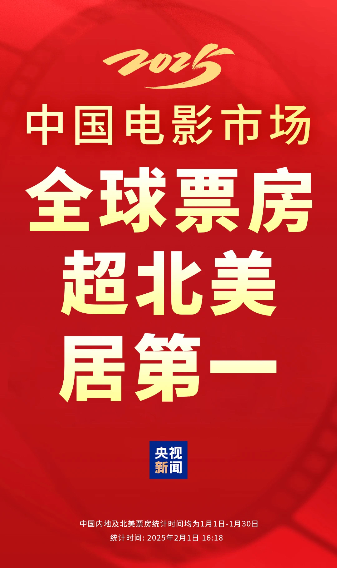 2月1日起,2025年中国电影市场累计票房超北美票房成绩,位列第一,领跑全球市场。