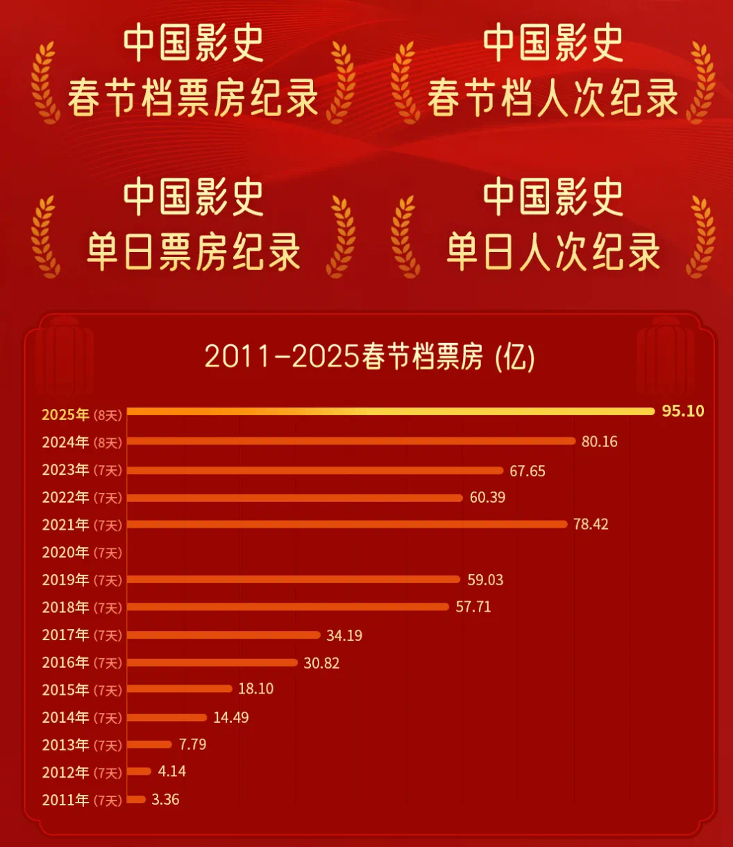 2月3日(大年初六)15时30分,今年春节档电影票房达80.20亿元,超越2024年春节档(80.16亿元)创下新的历史纪录。截至2月5日9时,2025年春节档票房为95.10亿元。
