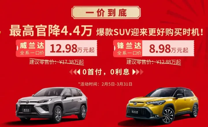 小鹏汽车也不甘示弱,推出“5年0首付0利息”购车政策,覆盖多款车型,至高贴息57000元。而广汽丰田在2025年新春开工的第一天就宣布了威兰达和锋兰达的全系一口价政策,锋兰达一口价8.98万元起,威兰达一口价12.98万元起,最高优惠幅度达到4.4万元。