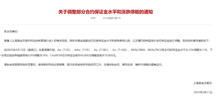 具体来看,《通知》称,自2025年2月12日(星期三)收盘清算时起,Au(T+D)、mAu(T+D)、Au(T+N1)、Au(T+N2)、NYAuTN06、NYAuTN12等合约的保证金水平从10%调整为11%,下一交易日起涨跌幅度限制从9%调整为10%;CAu99.99合约保证金每手65000元调整至每手70000元。
