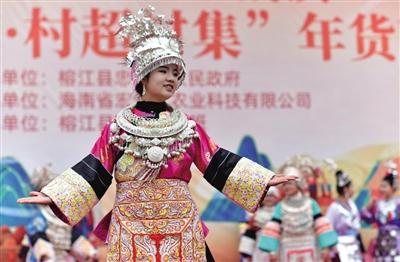 一名苗族女孩在贵州省榕江县忠诚镇“黔农乡市·村超村集”年货节活动中展示民族服饰。记者 杨文斌 摄