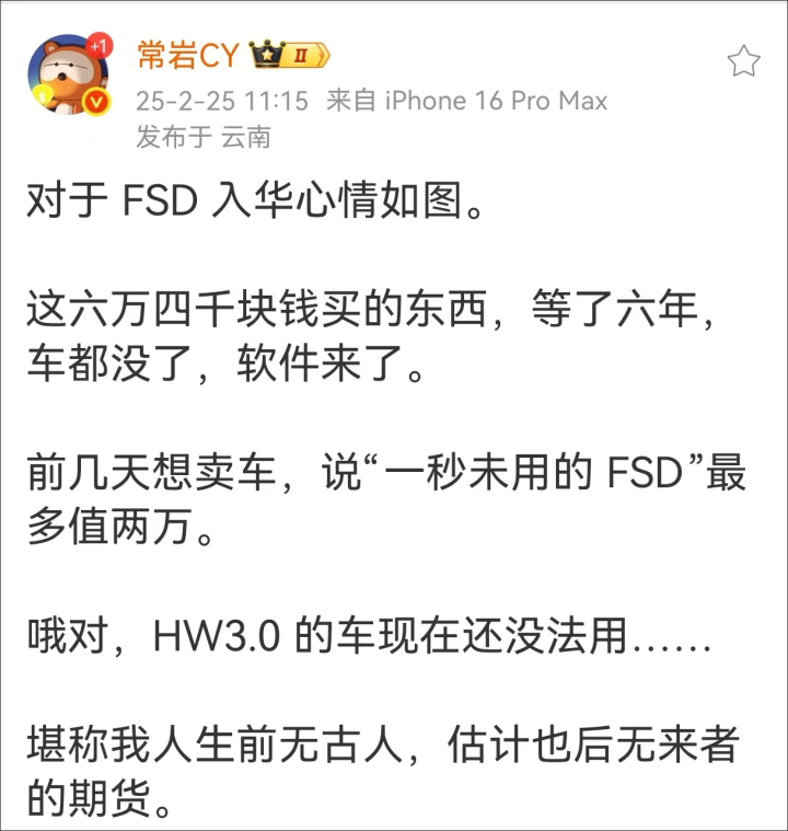 虽然FSD一直没有落地中国,但多年来,中国消费者在购买特斯拉新车时,仍可以选配FSD,费用是64000元人民币(最初的价格是56000元)。由于该功能迟迟未能落地,很多中国用户购车多年仍无法体验该功能,被车主们戏称为“期货”。知名汽车自媒体博主常岩今天就透露,自己的特斯拉买了6年,FSD功能一秒未用过,原本已经打算要卖掉了,没想到FSD软件来了,“堪称我人生前无古人,估计也后无来者的期货。”