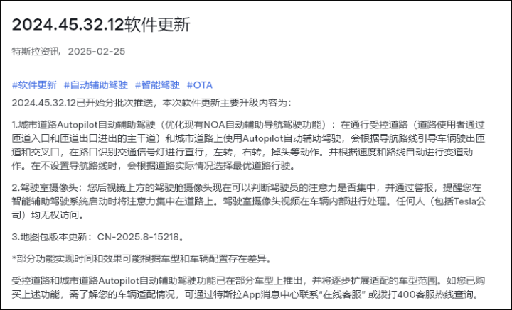 今天上午,特斯拉开始向选配了FSD智能辅助驾驶系统的中国用户分批次推送2024.45.32.12版本的OTA更新。本次更新主要升级内容包括城市道路Autopilot自动辅助驾驶、驾驶室摄像头监控驾驶员驾驶状态,以及更新地图包版本。这些功能将提供给已为特斯拉FSD功能支付6.4万元人民币的用户。