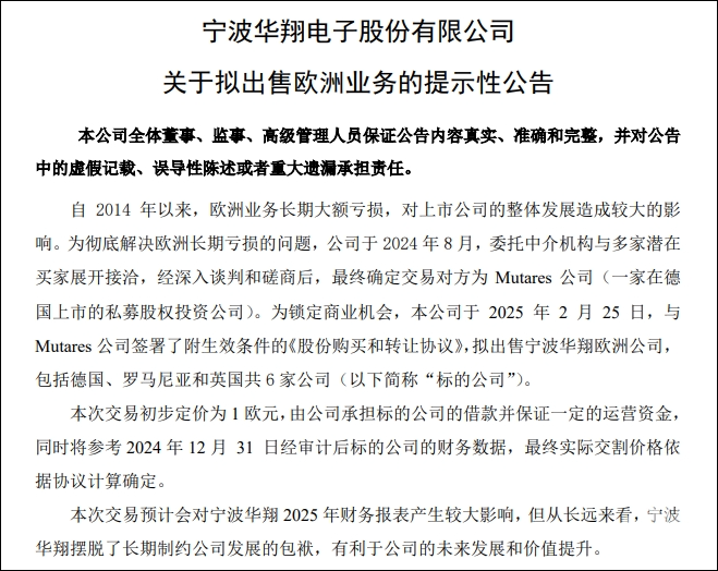 橙柿互动讯 对于连续亏了10年的欧洲业务,上市公司宁波华翔最终还是“下手”了。2月26日晚,宁波华翔公告,拟向德国公司Mutares出售宁波华翔欧洲公司,包括德国、罗马尼亚和英国共6家公司。本次交易初步定价为1欧元。