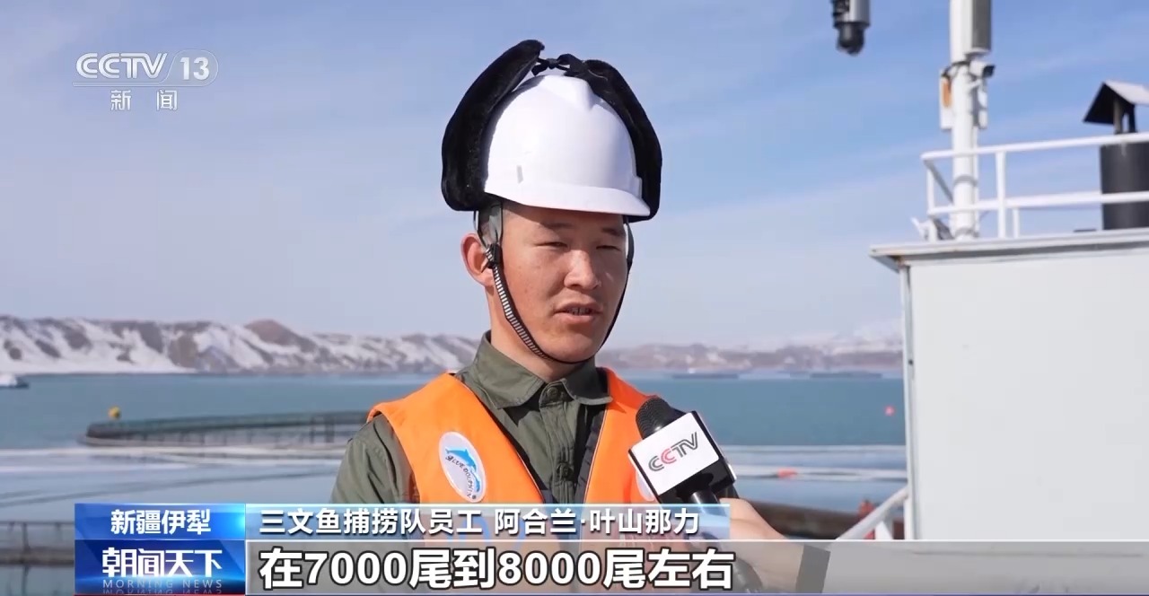 三文鱼捕捞队员工 阿合兰·叶山那力:最近我们的订单也比较多,每天的捕捞订单大约在7000到8000尾左右。