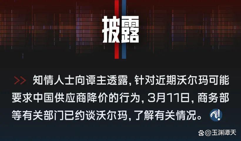 央视讯 知情人士向谭主透露,针对近期沃尔玛可能要求中国供应商降价的行为,3月11日,商务部等有关部门已约谈沃尔玛,了解有关情况。