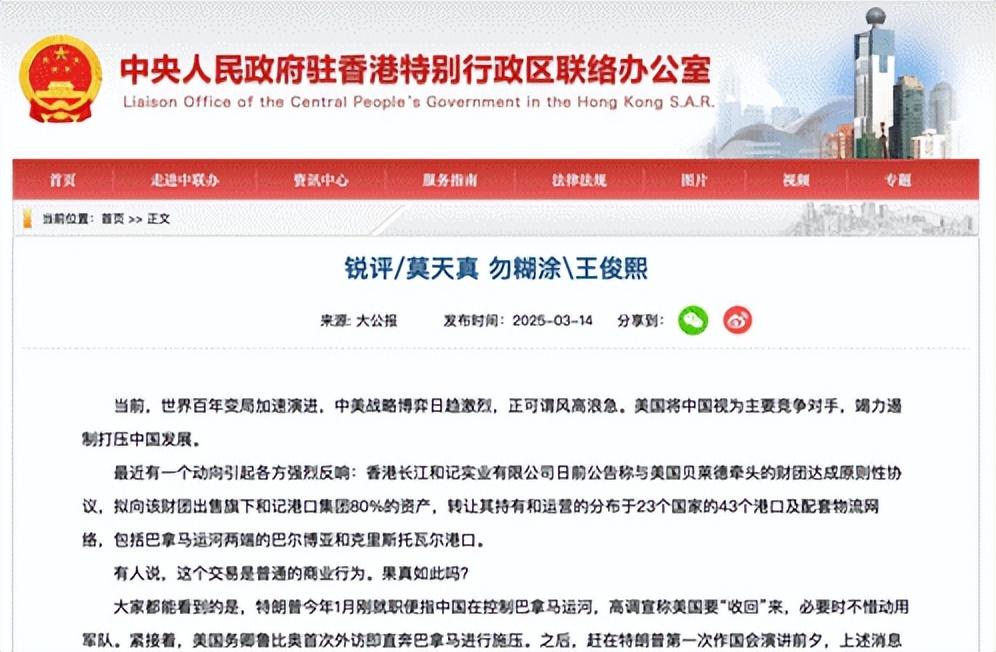 13日,中共中央港澳工作办公室与国务院港澳事务办公室的网站转载香港《大公报》文章,直截了当地抛出问题:这一切难道只是时间上的巧合?这到底是什么性质的交易?文章表示,香港长和出售港口并非“普通商业行为”,贝莱德完全可能通过这个交易,配合美国对华打压政策。甚至美国或将以这个交易为“范本”,通过政治施压在全球范围掀起港口并购,控制世界更多关键港口,并用“长臂管辖”实施打压手段,让中国船舶“无处可靠”。