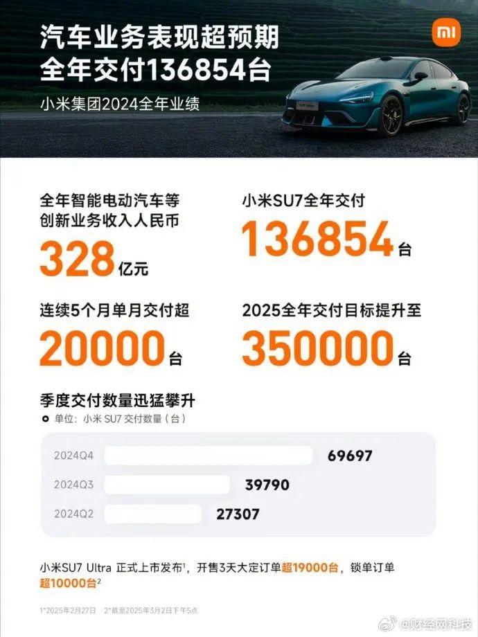 截至2024年12月31日,小米汽车共交付了136.854辆小米SU7系列汽车,智能电动汽车的ASP(平均销售价格)为每辆234.479元。
