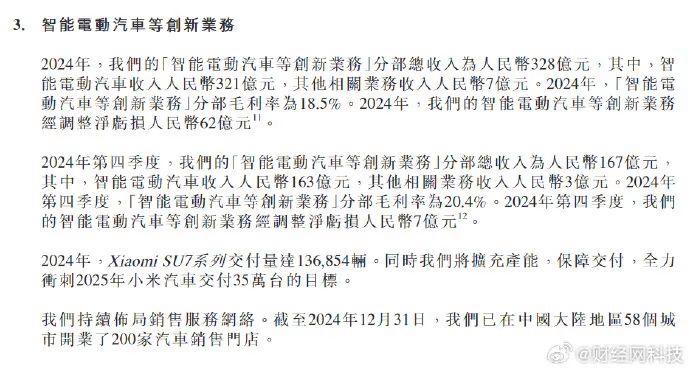 2024年,小米智能电动汽车等创新业务分部毛利率为18.5%,智能电动汽车等创新业务经调整净亏损人民币62亿元。