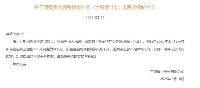 宁波银行3月18日公告称,由于近期国内金价波动较大,根据中国人民银行印发的《黄金积存业务管理暂行办法》,该行自2025年3月19日起将积存金起购金额由700元调整为800元,按重量起购克数维持1克不变。若购买金额不足800元的,交易申请将无法成功提交。