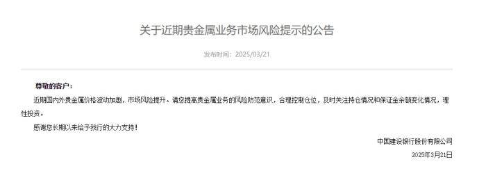 中国建设银行3月21日公告称,近期国内外贵金属价格波动加剧,市场风险提升。公告提醒客户,提高贵金属业务的风险防范意识,合理控制仓位,及时关注持仓情况和保证金余额变化情况,理性投资。