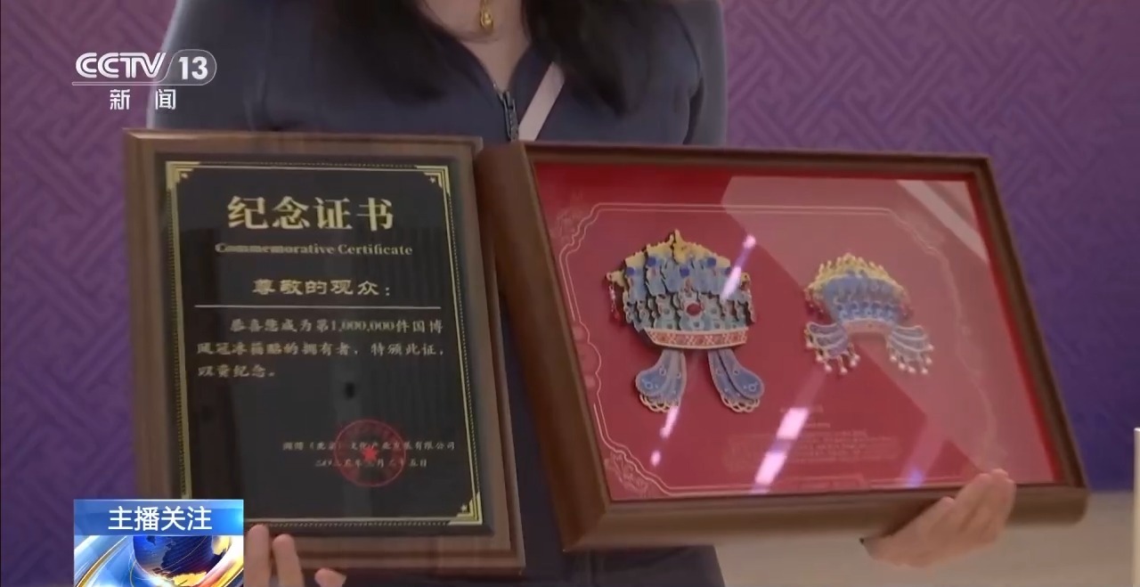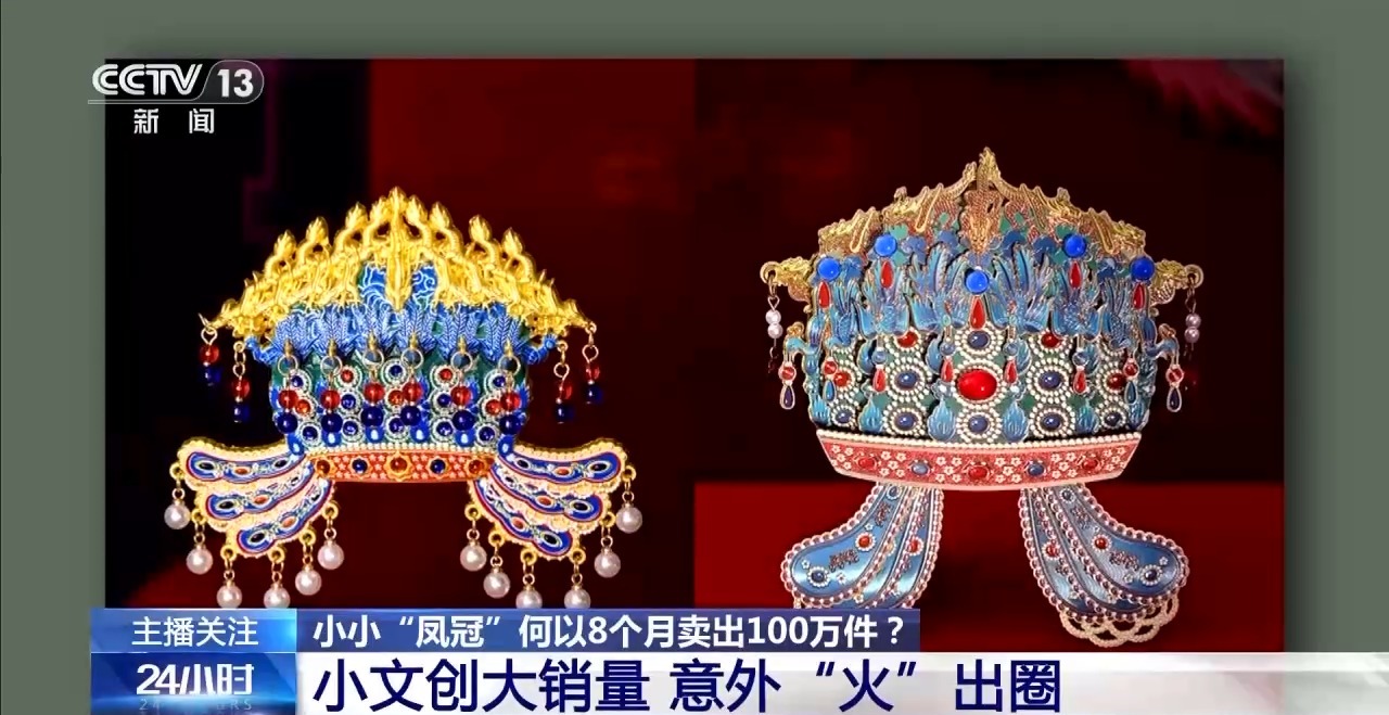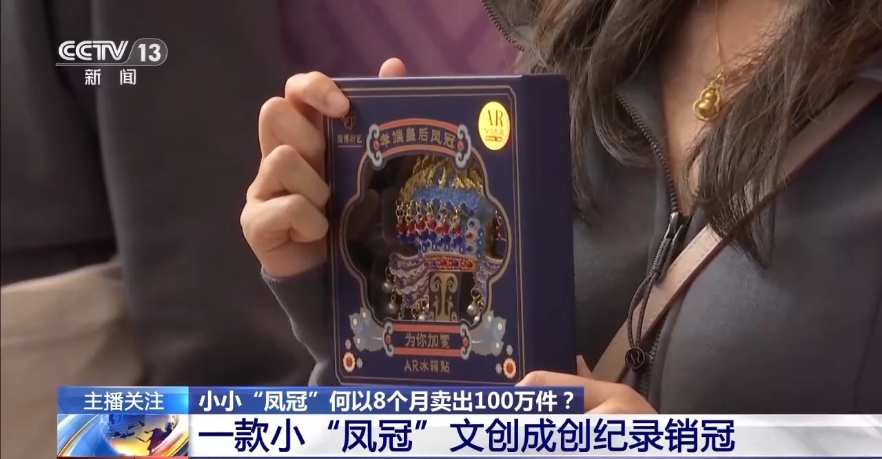 国博(北京)文化产业发展有限公司总经理 廖飞:首先发现有一些女观众会俯下身蹲在凤冠前面,来进行头戴凤冠的自拍。这种现象我们观察了一段时间发现越来越多,所以我们才把它拿出来做了一个文创产品。