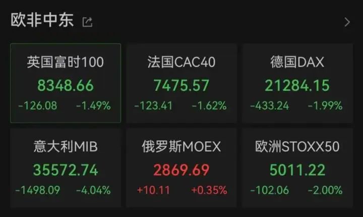 另外,继亚太市场后,今日,欧洲股市集体低开。Wind数据显示,截至北京时间16:58,欧洲三大股指均跌逾1%,仅俄罗斯MOEX指数小幅上涨。