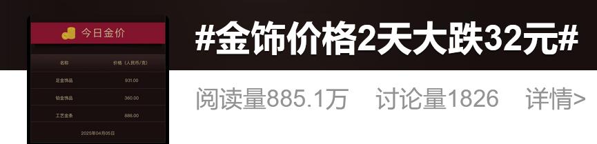 “金饰价格2天大跌32元”、“金价连续跳水”等话题,冲上热搜!