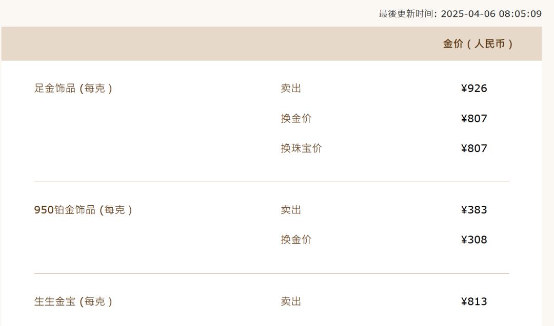 周生生足金饰品标价926元/克,较前一日948元/克的价格下跌22元/克,2天跌32元/克。老庙黄金足金饰品标价931元/克,较前一日946元/克的价格下跌15元/克,2天跌30元/克。周大福足金饰品标价932元/克,较前一日下跌20元/克。