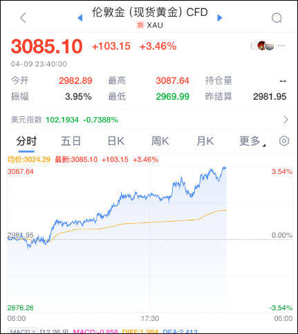 橙柿互动综合 据中国基金报报道,4月9日,金价再次暴涨,现货黄金站上3080美元/盎司,日内上涨3.46%。